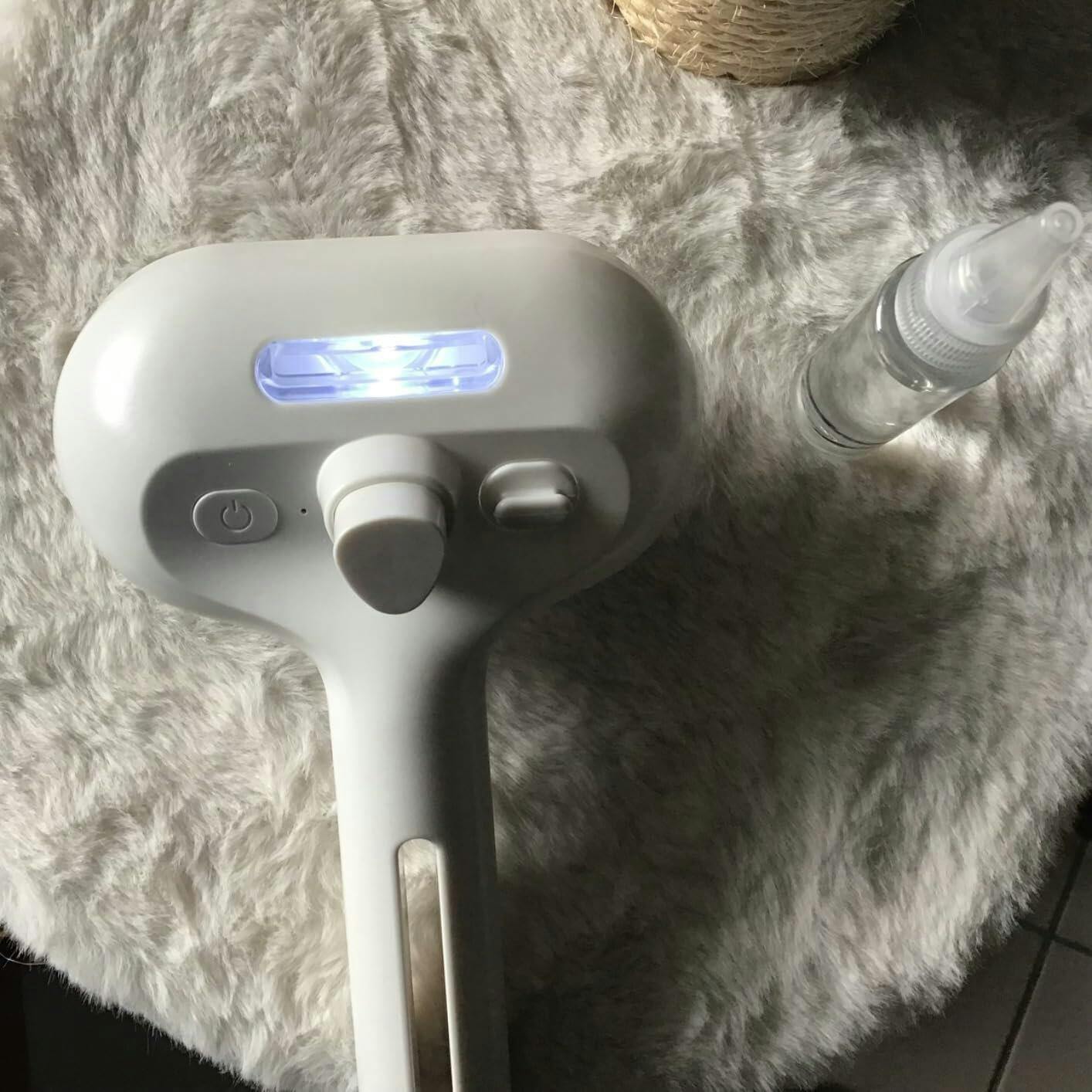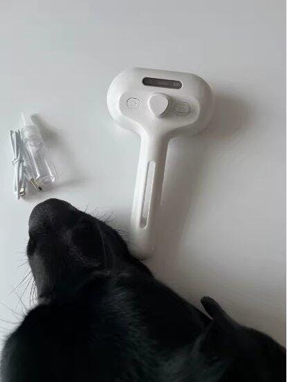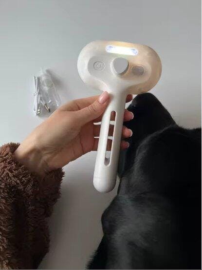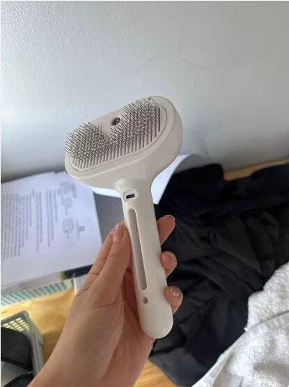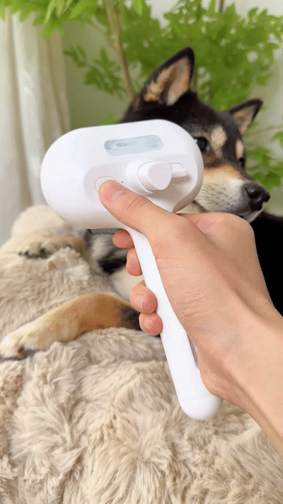 4. 🌫️ Premi il pulsante spray per attivare la nebulizzazione e inizia a passare la spazzola sul pelo del tuo cane