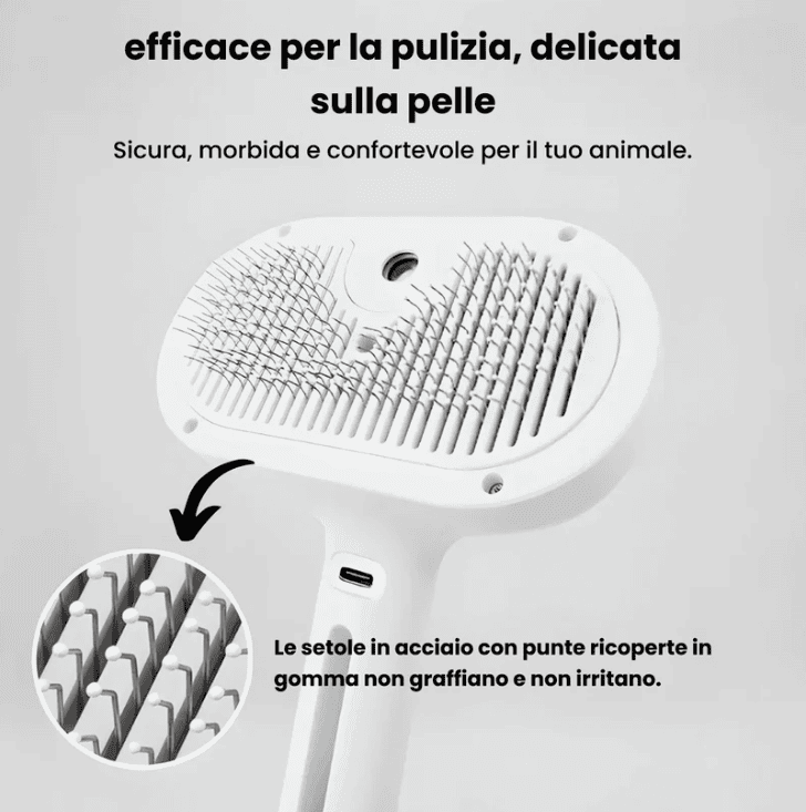 Semplicissimo! Dopo aver finito di spazzolare, basta premere il pulsante autopulente sul retro della spazzola. Le setole si ritraggono leggermente e tutti i peli raccolti si staccano immediatamente, permettendoti di gettarli nel cestino senza doverli toccare con le mani. Risparmia tempo e mantiene la spazzola sempre pulita.